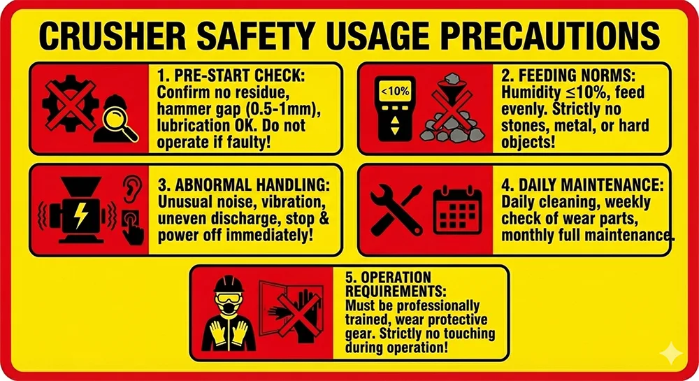 Kivételkezelés: Ha a berendezés üzemel, furcsa zajok, erős rezgések vagy különböző vastagságú összetört anyagok hallhatók, azonnal le kell állítani, és meg kell szakítani az áramellátást. Először ellenőrizze, hogy a kalapács nem kopott-e el, vagy nincs-e eltömődve a simítókerék. A probléma megoldása után indítsa újra a gépet.